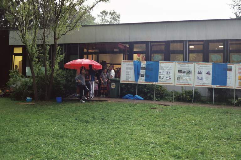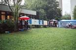 ... aber draußen war mehr als nur etwas feucht. Es schüttete wie aus Eimern! Wir richteten uns dort gemütlich ein, die Kinder bekamen in dem großen Nebenraum ein Kasperltheater geboten. Draußen harrten wenige noch im Regen aus. Hier der Eisstand des Elternbeirates der KITAs Lauchhau-Lauchäcker.