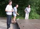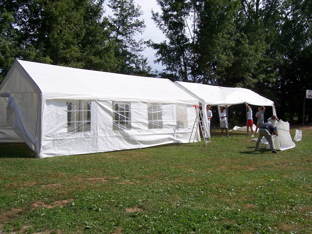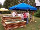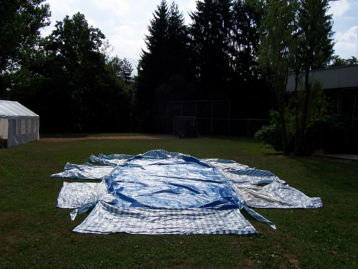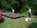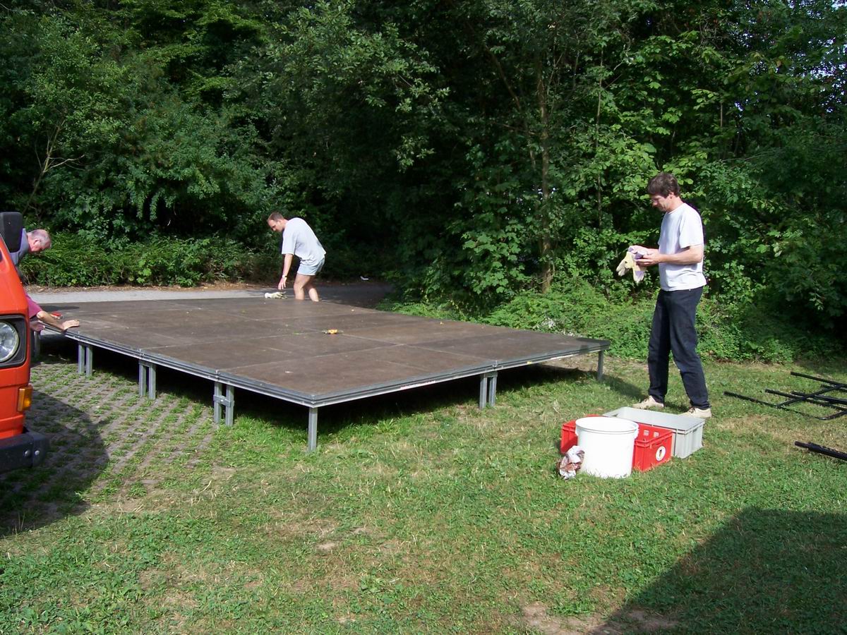 Die Bühnenelemente werden abgebaut ... .. und wieder in den Keller des Bezirksrathauses eingelagert. Ein BüFo-Pavillon liegt zum Trocknen in der Sonne.