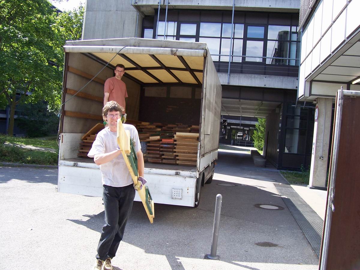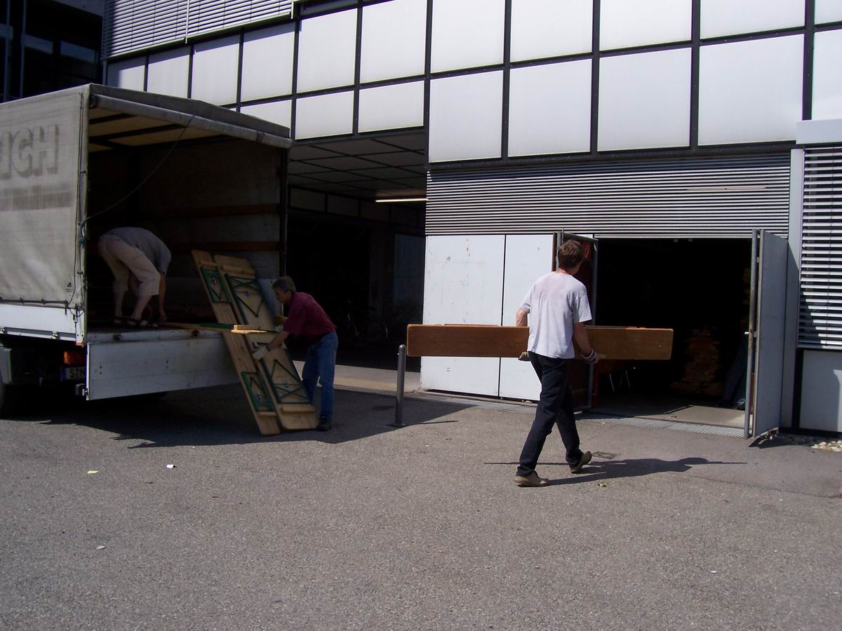 Die Biertischgarnituren kommen wieder zurück ... in die Lagerhalle der Universität Stuttgart. Das ist schon immer Knochenarbeit. Aber bei vielen Helfern geht das auch schneller.