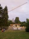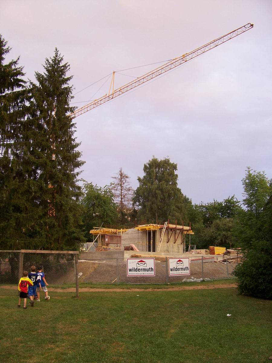 Die meisten Biertischgarnituren sind schon zusammen geklappt. Ein Blick auf die Baustelle des Kinder- und Bürgerhauses Lauchhau-Lauchäcker. Die Wiese ist wieder leer und die Zelte werden am Sonntag alle abgebaut.